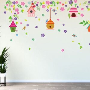 1bhaav Beautiful Colorful Flowers Bird Houses Wall Sticker