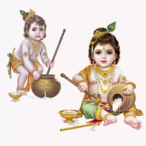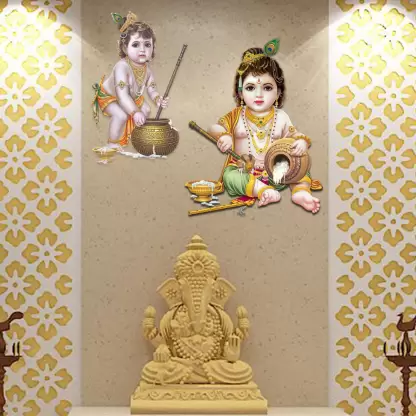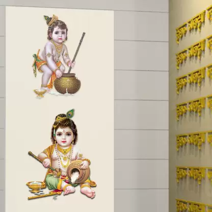 A 1bhaav Bal Gopal Krishan Sticker also known as a wall decal or wall graphic, is a decorative element that is designed to be applied directly onto a wall or other smooth surface. It is made from a thin, adhesive-backed material, typically vinyl, which allows it to adhere securely to the wall without causing any damage when removed. Wall stickers come in a wide variety of designs, sizes, and colors, making them a versatile option for adding a touch of creativity and personalization to any living space. They can feature various images, patterns, quotes, or illustrations, catering to different tastes and preferences. The application of a wall sticker is relatively simple. The backing paper is peeled off, revealing the adhesive side of the sticker. It is then carefully pressed onto the desired surface, ensuring a smooth and bubble-free application. Once in place, the sticker can be adjusted or repositioned if necessary. Some wall stickers may come with additional elements, such as separate pieces or layers, which can be applied separately to create a more intricate design.1bhaav Bal Gopal Krishan Sticker are often used in interior design to enhance the aesthetic appeal of a room. They can be applied to walls, doors, windows, furniture, or any other smooth surface that is suitable for adhesion. Common places to use wall stickers include bedrooms, living rooms, nurseries, offices, and classrooms. One of the advantages of wall stickers is that they are temporary and can be easily removed without leaving any residue or causing damage to the surface. This makes them a popular choice for those who want to update their home décor frequently or for renters who cannot make permanent changes to their living space. In summary, a wall sticker is a self-adhesive decorative element that allows individuals to personalize their living space with various designs, patterns, quotes, or illustrations. It is easy to apply, repositionable, and removable, making it a versatile option for adding creativity and visual interest to any room