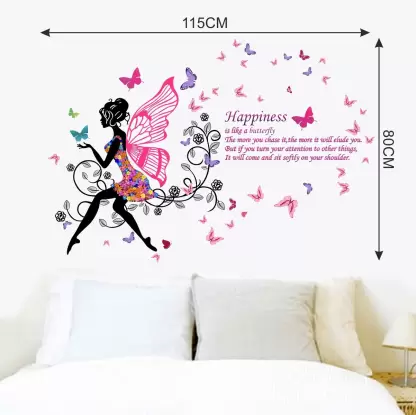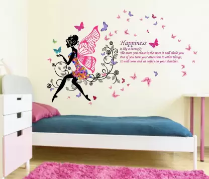 A 1bhaav Happiness Is Like a Butterfly Quotes Wall Stickers  also known as a wall decal or wall graphic, is a decorative element that is designed to be applied directly onto a wall or other smooth surface. It is made from a thin, adhesive-backed material, typically vinyl, which allows it to adhere securely to the wall without causing any damage when removed. Wall stickers come in a wide variety of designs, sizes, and colors, making them a versatile option for adding a touch of creativity and personalization to any living space. They can feature various images, patterns, quotes, or illustrations, catering to different tastes and preferences. The application of a wall sticker is relatively simple. The backing paper is peeled off, revealing the adhesive side of the sticker. It is then carefully pressed onto the desired surface, ensuring a smooth and bubble-free application. Once in place, the sticker can be adjusted or repositioned if necessary. Some wall stickers may come with additional elements, such as separate pieces or layers, which can be applied separately to create a more intricate design.1bhaav Happiness Is Like a Butterfly Quotes Wall Stickers are often used in interior design to enhance the aesthetic appeal of a room. They can be applied to walls, doors, windows, furniture, or any other smooth surface that is suitable for adhesion. Common places to use wall stickers include bedrooms, living rooms, nurseries, offices, and classrooms. One of the advantages of wall stickers is that they are temporary and can be easily removed without leaving any residue or causing damage to the surface. This makes them a popular choice for those who want to update their home décor frequently or for renters who cannot make permanent changes to their living space. In summary, a wall sticker is a self-adhesive decorative element that allows individuals to personalize their living space with various designs, patterns, quotes, or illustrations. It is easy to apply, repositionable, and removable, making it a versatile option for adding creativity and visual interest to any room
