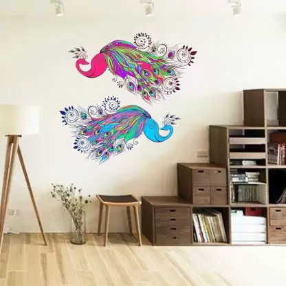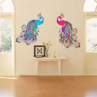 A 1bhaav Peacock Pair Wall Sticker  also known as a wall decal or wall graphic, is a type of decorative adhesive design that is typically applied directly to walls or other smooth surfaces. It is a versatile and convenient way to enhance the aesthetic appeal of a room without the need for extensive painting or permanent modifications. Wall stickers come in a wide variety of designs, sizes, and materials to suit different preferences and purposes. They can be made from vinyl, which is a durable and flexible material that adheres well to surfaces, or other types of removable adhesive materials. The designs of 1bhaav Peacock Pair Wall Sticker range from simple patterns and shapes to intricate illustrations, landscapes, quotes, and even customized graphics. They can depict nature scenes, animals, geometric shapes, flowers, famous landmarks, popular characters, and much more. Some wall stickers are specifically designed for children’s rooms, featuring cartoon characters or educational elements. Applying a wall sticker is usually a straightforward process. The sticker is typically supplied as a single sheet or multiple pieces, depending on the design. It is usually accompanied by a protective backing paper that needs to be removed before sticking it to the wall. Once the backing paper is peeled off, the adhesive side of the sticker is pressed onto the desired surface, ensuring it is smooth and free from dust or debris. The sticker can then be smoothed out to remove any air bubbles and ensure proper adhesion. One of the advantages of wall stickers is their removable nature. They can be easily peeled off from the surface without leaving residue or causing damage to the wall. This makes them an excellent choice for those who want to experiment with different designs or prefer to change the decor frequently. Overall, wall stickers provide a convenient and cost-effective way to personalize and enhance the appearance of a room. They offer a wide range of design options and can be easily applied and removed, making them a popular choice for both temporary and long-term decoration.