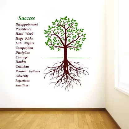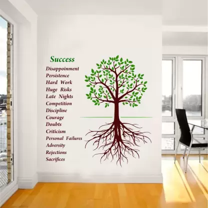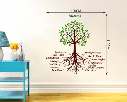 A 1bhaav Success Tree Wall Stickers also known as a wall decal or wall graphic, is a decorative element that is designed to be applied directly onto a wall or other smooth surface. It is made from a thin, adhesive-backed material, typically vinyl, which allows it to adhere securely to the wall without causing any damage when removed. Wall stickers come in a wide variety of designs, sizes, and colors, making them a versatile option for adding a touch of creativity and personalization to any living space. They can feature various images, patterns, quotes, or illustrations, catering to different tastes and preferences. The application of a wall sticker is relatively simple. The backing paper is peeled off, revealing the adhesive side of the sticker. It is then carefully pressed onto the desired surface, ensuring a smooth and bubble-free application. Once in place, the sticker can be adjusted or repositioned if necessary. Some wall stickers may come with additional elements, such as separate pieces or layers, which can be applied separately to create a more intricate design.1bhaav Success Tree Wall Stickers are often used in interior design to enhance the aesthetic appeal of a room. They can be applied to walls, doors, windows, furniture, or any other smooth surface that is suitable for adhesion. Common places to use wall stickers include bedrooms, living rooms, nurseries, offices, and classrooms. One of the advantages of wall stickers is that they are temporary and can be easily removed without leaving any residue or causing damage to the surface. This makes them a popular choice for those who want to update their home décor frequently or for renters who cannot make permanent changes to their living space. In summary, a wall sticker is a self-adhesive decorative element that allows individuals to personalize their living space with various designs, patterns, quotes, or illustrations. It is easy to apply, repositionable, and removable, making it a versatile option for adding creativity and visual interest to any room