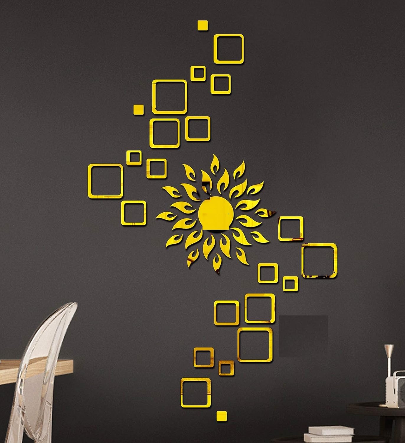 1BHAAV Sun Golden with Square Golden 4 Set Decorative Mirror Stickers for Wall Acrylic Stickers Acrylic mirror wall decor stickers are a stylish and versatile way to enhance the aesthetic appeal of your living space. These stickers are designed to mimic the appearance of real mirrors but are made from lightweight and durable acrylic material.Crafted from high-quality acrylic, these mirror wall decor stickers are lightweight, shatterproof, and safer than traditional glass mirrors. The use of acrylic also makes them more resistant to scratches and damage.The stickers are designed to replicate the reflective properties of traditional mirrors, providing a clear and distortion-free reflection. This adds a touch of elegance and the illusion of extra space to any room.Acrylic mirror wall decor stickers are easy to install without the need for special tools or professional assistance. 1BHAAV Sun Golden with Square Golden 4 Set Decorative Mirror Stickers for Wall Acrylic Stickers Most stickers come with a peel-and-stick backing, allowing you to adhere them directly to smooth surfaces like walls, doors, or furniture.